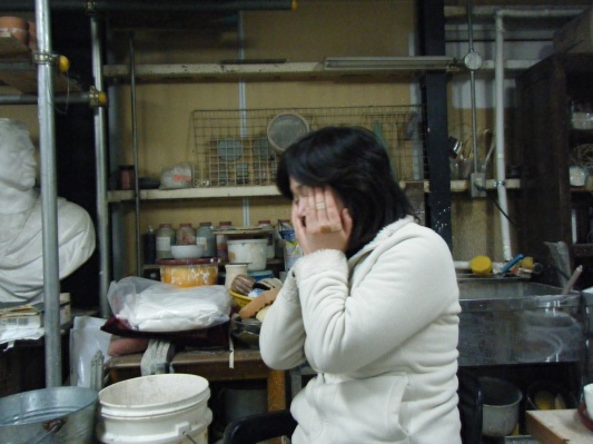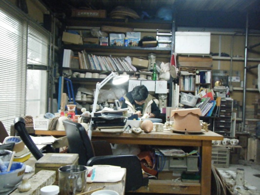 正憲さんは工房の奥で一心不乱に筆を動かし陶器に向かっている。。棟方志功かと思った。