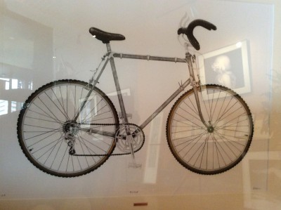 今日も一階のロジェさんには 一杯、いろんな形のカッコイイ自転車がとまっている。 その中で極めて普通な私の自転車は少し離れた場所に保管しているんだけど。 でも 2階のおのまち店内には、誰にも負けないバーナード・ザロンの「自転車」が あります。 自転車好きな人、階段を上がって来てネ!
